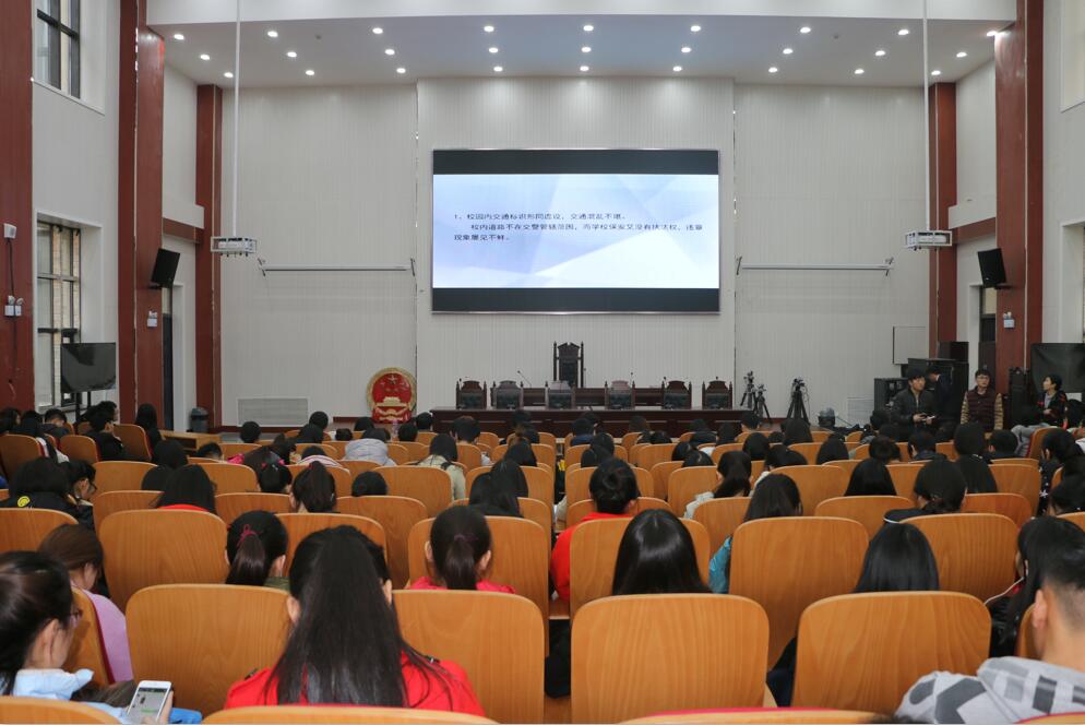 各学生班级班长、支书在模拟法庭共同观看“校园安全隐患排查与事故警示”宣传片。