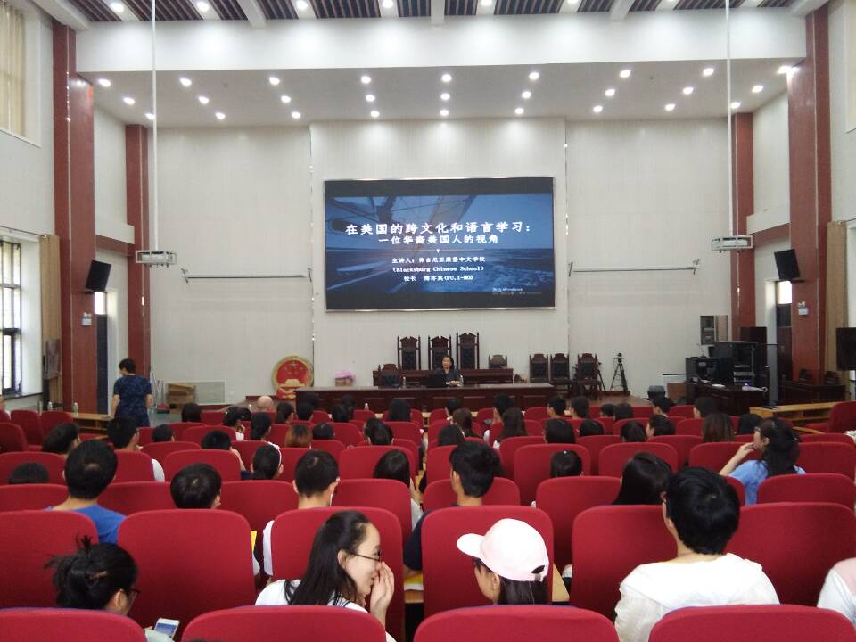 为加深学子对美国语言文化的的了解、提高学子们的语言文化综合素养,5月24日16:00,国际著名语言学家美国弗吉尼亚黑堡中文学校校长傅亦莫在模拟法庭为学子做了题为“在美国的跨文化和语言学习,一个美国人的视角”的专题讲座。教师代表和广大学子与会。讲座开始前,副院长酒梅菊致辞,介绍傅亦莫校长并表示感谢。傅校长就美国文化的组成特点、美国不同民族间的不同思想、在美国华裔的生活、中美文化差异四个方面分别论述,提出了自己独到的见解。讲座精彩纷呈,现场气氛活跃,场下不时传来雷鸣般的掌声。之后的现场提问环节,傅校长对学子的问题一一答复,将场上气氛推向新的高潮,最后副院长酒梅菊总结了讲座的主要内涵并再次对傅亦莫校长表示感谢,讲座在阵阵掌声中闭幕。
