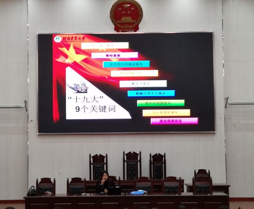 沈书记就进一步学习传达贯彻党的十九大精神进行了再深入、再动员。并为大家详细解读了“十九大”的9个关键词,分别是:“双一流”建设、尊师重教、全方位公共就业服务、倡导创新文化、聚天下英才、鼓励引导人才流动、青年兴则国家兴、关心和爱护青年、坚定理想信念,振奋人心。同时,她明确提出对学生学习及正确处理学习与工作的关系的要求,鼓励大家团结一致,共同进步,认真学习,学以致用。