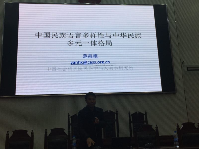 2018年3月29日下午免费色情片 特邀中国社会科学院民族学与人类学研究所应用语言学研究室副主任,硕士生导师燕海雄副研究员于免费色情片 模拟法庭开展题为《中国民族语言多样性与中华民族多元一体格局》的学术报告会。免费色情片 汉语国际教育专业全体师生参加,院长王晓勇主持报告会。