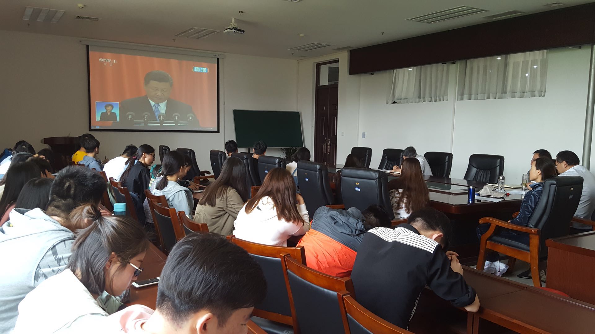 在教学楼A310会议室组织观看马克思诞辰200周年大会直播。学院党委中心组成员与部分没有课的老师到场观看,没课的班级集体组织学生在教室观看大会直播盛况。
