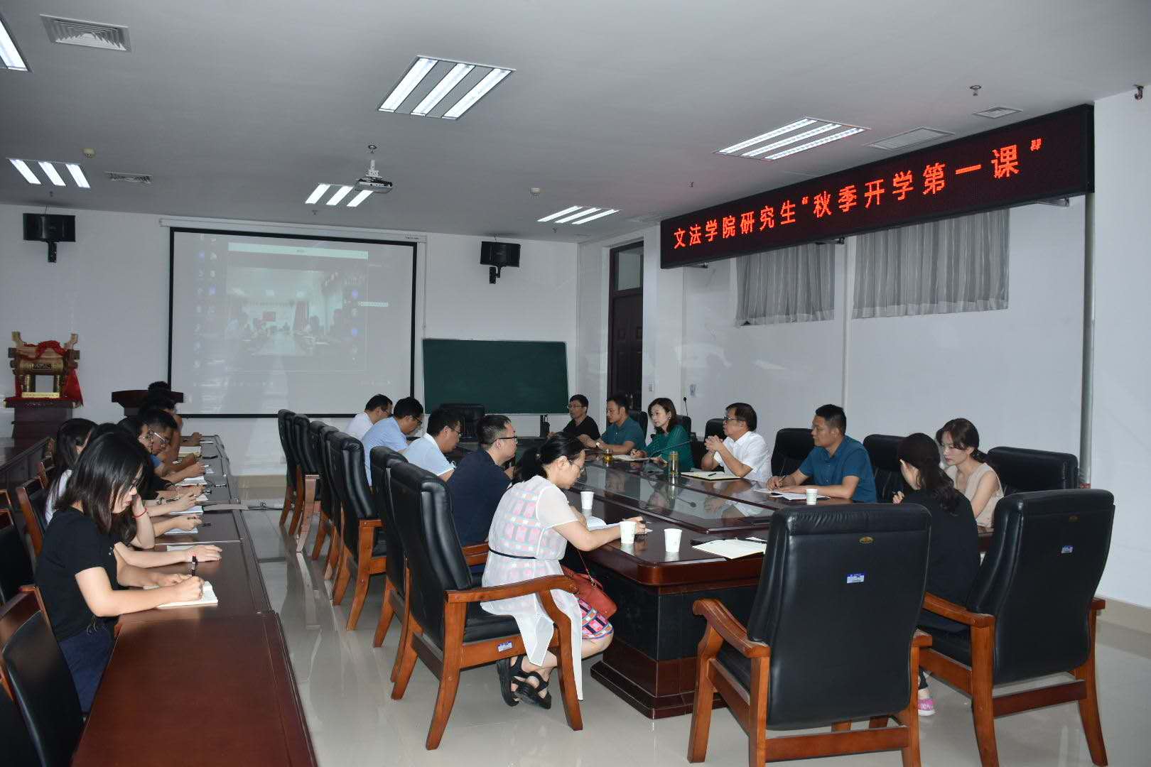 于龙子湖校区教学楼A座学院会议室召开研究生“秋季开学第一课”。院党委书记牛娟、院长王晓勇、校政策法规办公室副主任张帅梁、研究生导师、班主任和全体研究生参会,会议由学院副科级组织员朱瑞萍主持。
