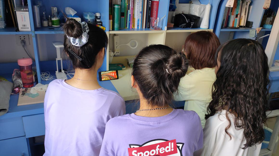 学生以宿舍为单位观看表彰大会