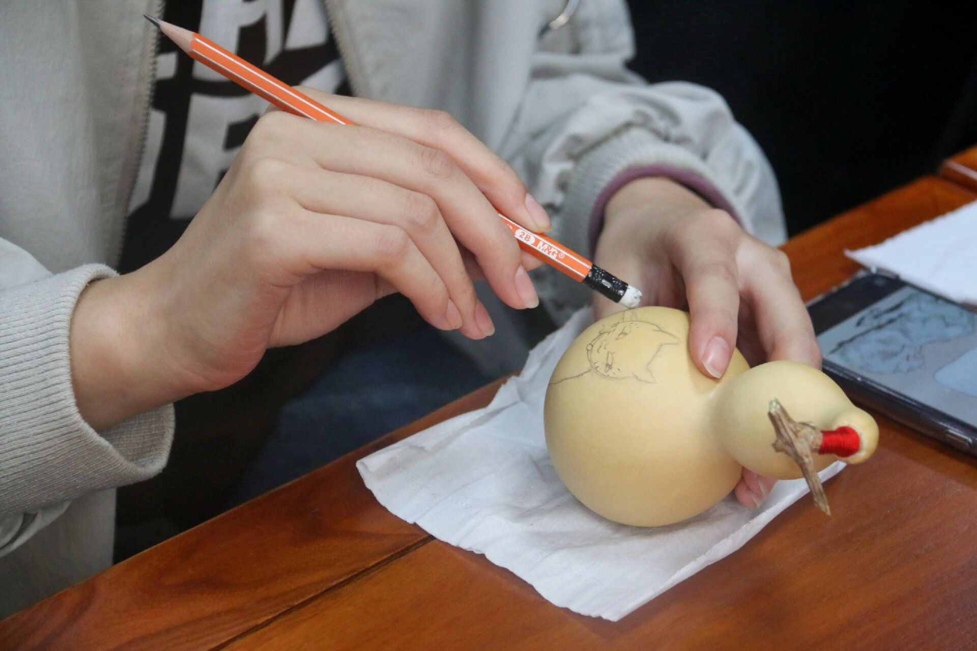描画涂写,尽展诗意;手执一笔,勾勒风华。或小巧玲珑,珊珊可爱;或稍大于此,高约尺许。一个个普通的葫芦在李彦杰的手中腐朽复化神奇变为精巧绝伦的珍品。李彦杰分别就烙画的历史背景、种类、发展与风靡作了详细介绍,充分彰显了烙画的独特魅力,让与会师生大饱眼福,受益匪浅。实践教学环节,李彦杰悉心指导同学进行烙画创作。同学们不拘一格,恣意发挥,以瑰丽的想象,细腻的手法创作了一个个可圈可点的作品,得到李彦杰的深情鼓励与积极赞许,极大增强了同学们创作的信心。
