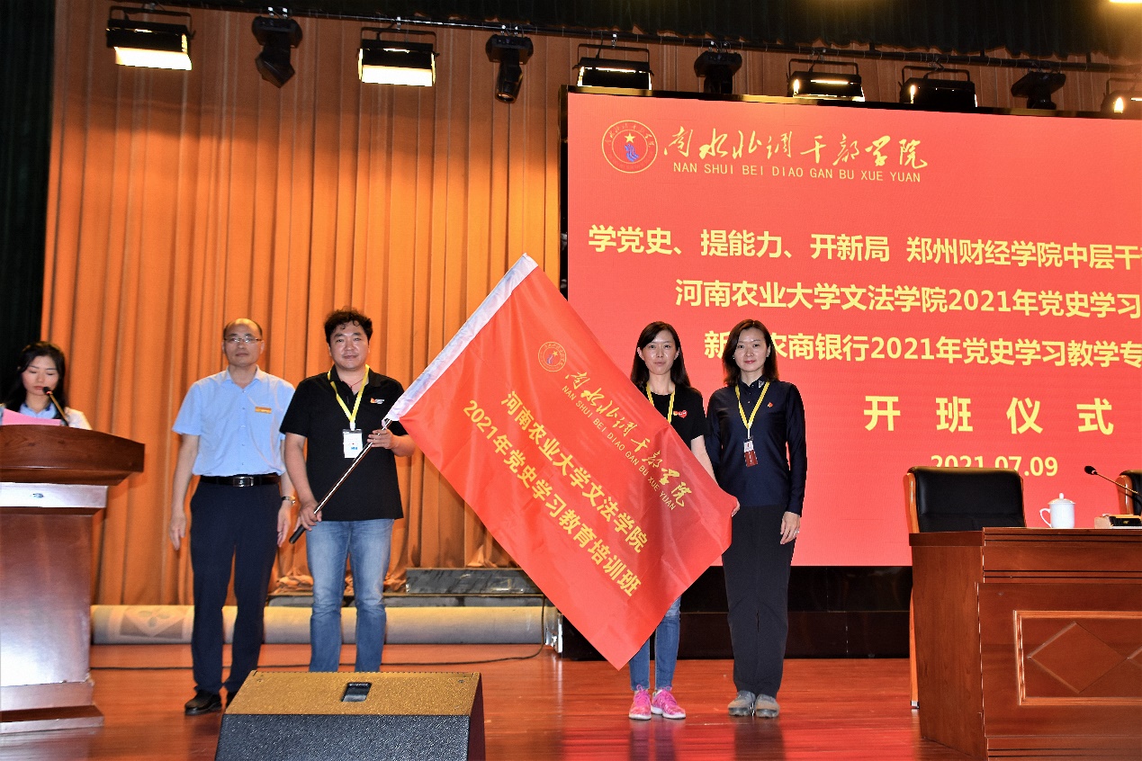 9日下午,开班仪式在南水北调干部学院综合楼一楼报告厅举行。南水北调干部学院党委委员、副院长包晓在开班仪式上致辞,介绍了南水北调中线工程和南水北调干部学院的基本情况。随后,包晓和学院党委书记牛娟共同为参训学员代表授旗。开班仪式后,南水北调干部学院培训联络部部长郭度以《南水北调精神及其时代价值》为题作报告。他从南水北调工程50余年的发展概况、南水北调精神的实质、时代价值和如何结合党史学习教育弘扬南水北调精神等方面进行了深刻分析。使老师们深刻感受到了南水北调精神内涵和国家重大战略性工程的时代价值。