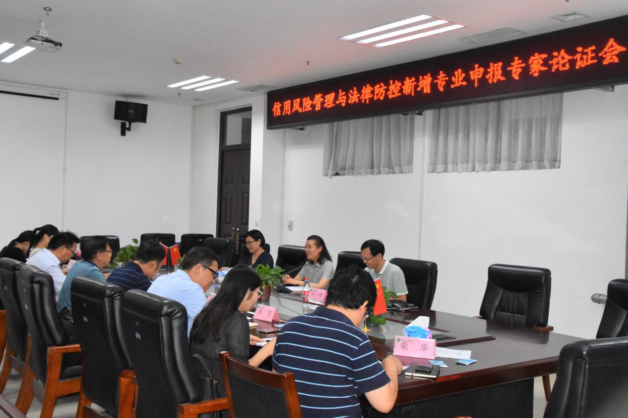 论证信用风险管理与法律防控新增专业申报。校政策法规办公室副主任张帅梁、学院院长王晓勇、副院长杨红朝及信用风险管理与法律防控新增专业申报撰写组成员参加论证会。