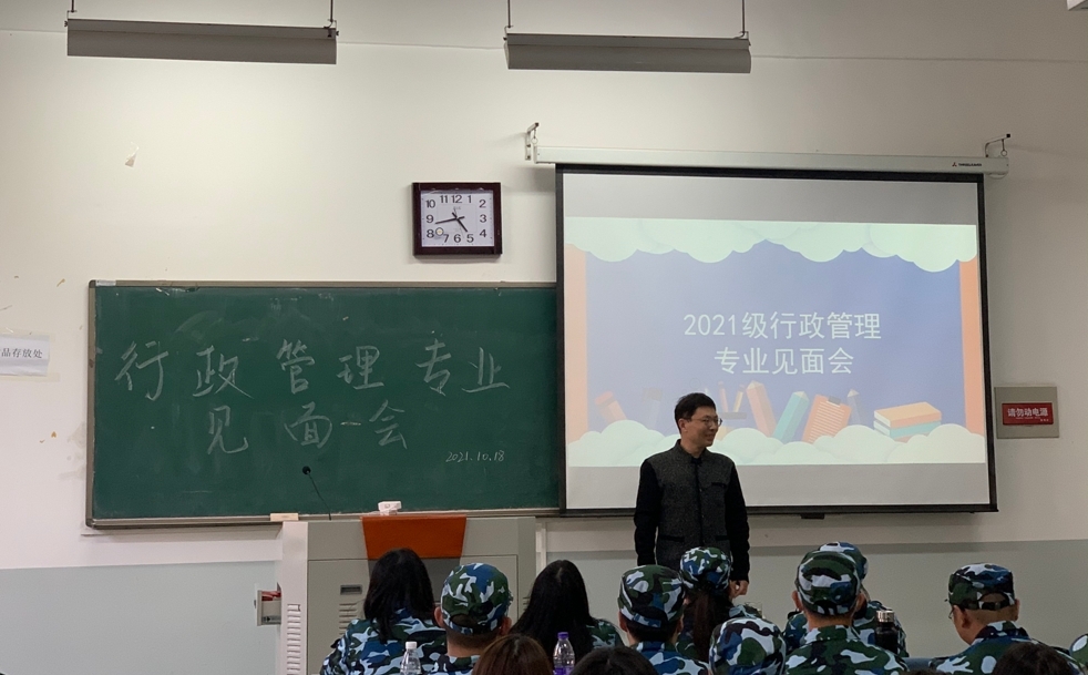 行政管理系召开行政管理专业2021级新生专业介绍会。行政管理系全体教师和2021级行政管理专业全体新生参加会议。会议由行政管理系主任管煜武主持。