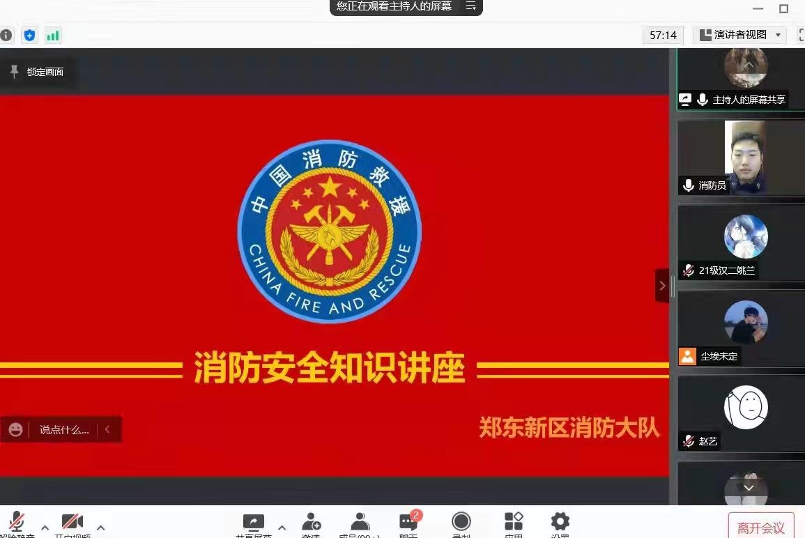 通过线上方式举办了以“学习消防知识 共享平安校园”为主题的消防知识宣传活动。郑东新区消防大队消防员代表、21级辅导员赵梦闪出席活动,免费色情片