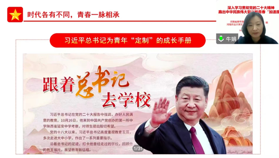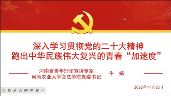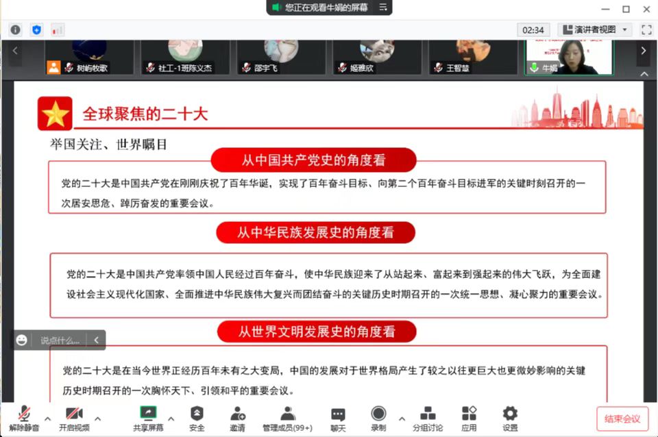报告会围绕“全球聚焦的二十大”、“踔厉奋发的二十大”和“跑出二十大精神指引下的青春‘加速度’”三部分开展。牛娟首先从国际局势入手,分析了我国在全球发展中的重要地位,以及全球聚焦二十大的形势。她从中国共产党史、中华民族发展史、世界文明发展史的角度,讲述了党的二十大的重要意义。她讲到,二十大的召开彰显了我党在新的赶考路上,向历史和人民交出一份满意答卷的必胜信心和坚定信念。