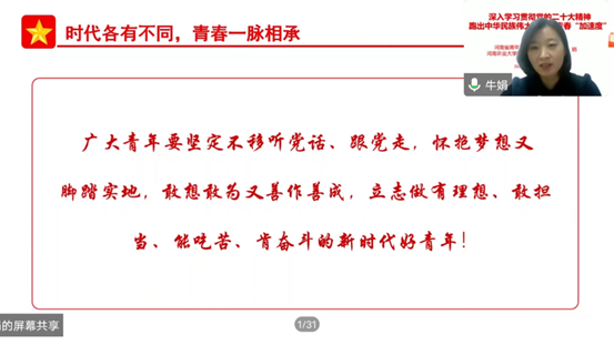 在谈及“跑出二十大精神指引下的青春‘加速度’”时,她通过播放一段“跨越百年时空的青春对话”短视频引入,向青年学生提出倡议,鼓励青年学子把自己的价值和梦想同国家的发展相契合,同国家的命运相结合,砥砺奋进,脚踏实地,做有理想、敢担当、能吃苦、肯奋斗的新时代好青年,让青春在奋斗中绽放出绚丽之花。