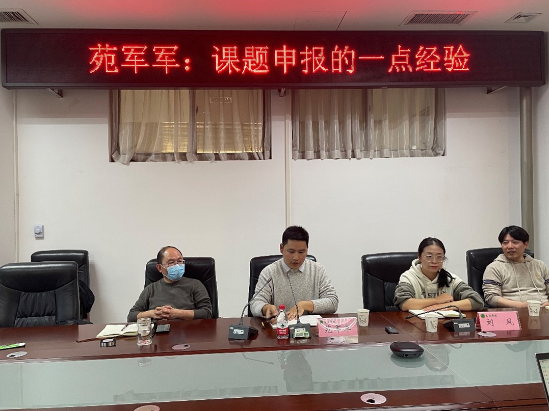 苑军军以《课题申报的一点经验》为主题进行交流。他主要从选题思考、文献思考两个方面来分享项目申报的经验。他从博士的调研经历出发,探讨博士论文与项目申报选题的关系,并对如何选择调研地点、分析调研优势进行讲解;在文献思考方面,他从寻找核心文献、寻找理论框架两个方面来对项目的研究基础进行分析。最后,他鼓励老师们要不断的申报项目、锻炼自己。