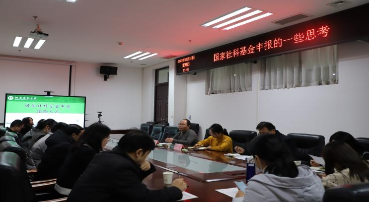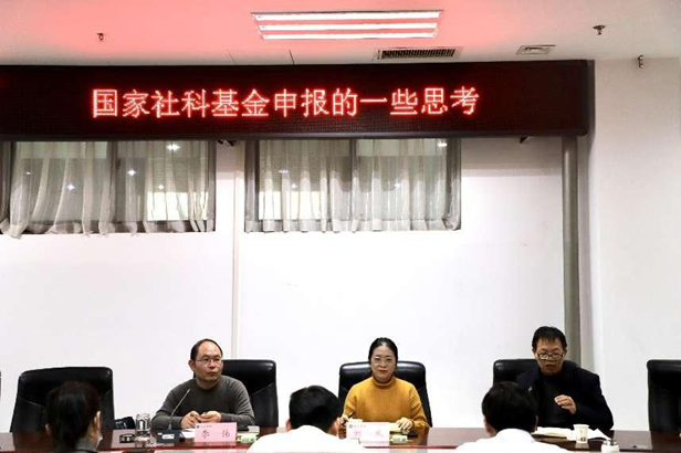 李伟以《国家社科基金申报的一些思考》为主题进行分享。他从个人申报项目的经历出发,从选题、破题、论证等方面展开交流。他指出,“选题要新、破题要准、论证要透”,选题上要以现实问题为导向,与时俱进,发现新事物、新现象;破题上要找准切入点,语言精炼概括;论证上注重内容结构和排版格式,给评委专家组留下良好的整体印象。