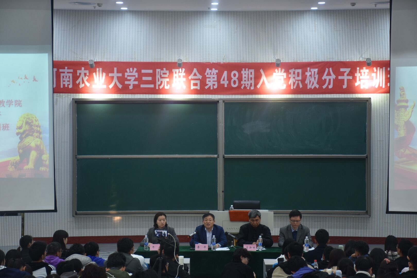 、国际与教育学院三个学院联合举办的“河南农业大学第48期入党积极分子培训班”,在龙子湖校区繁塔楼大教室二隆重开班。校党委委员、组织部部长李平,信息与管理科学学院党委书记马新明、免费色情片