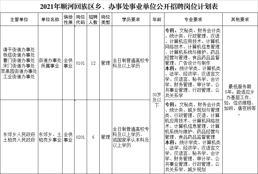 本次顺河回族区乡、办事处事业单位公开招聘工作人员共计18人。具体招聘单位、拟招聘专业、岗位、人数及要求详见《2021年顺河回族区乡、办事处事业单位公开招聘岗位计划表》。