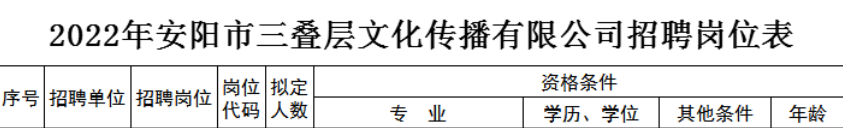 各职位要求详见《2022年安阳市三叠层文化传播有限公司招聘岗位表》(附件1)。